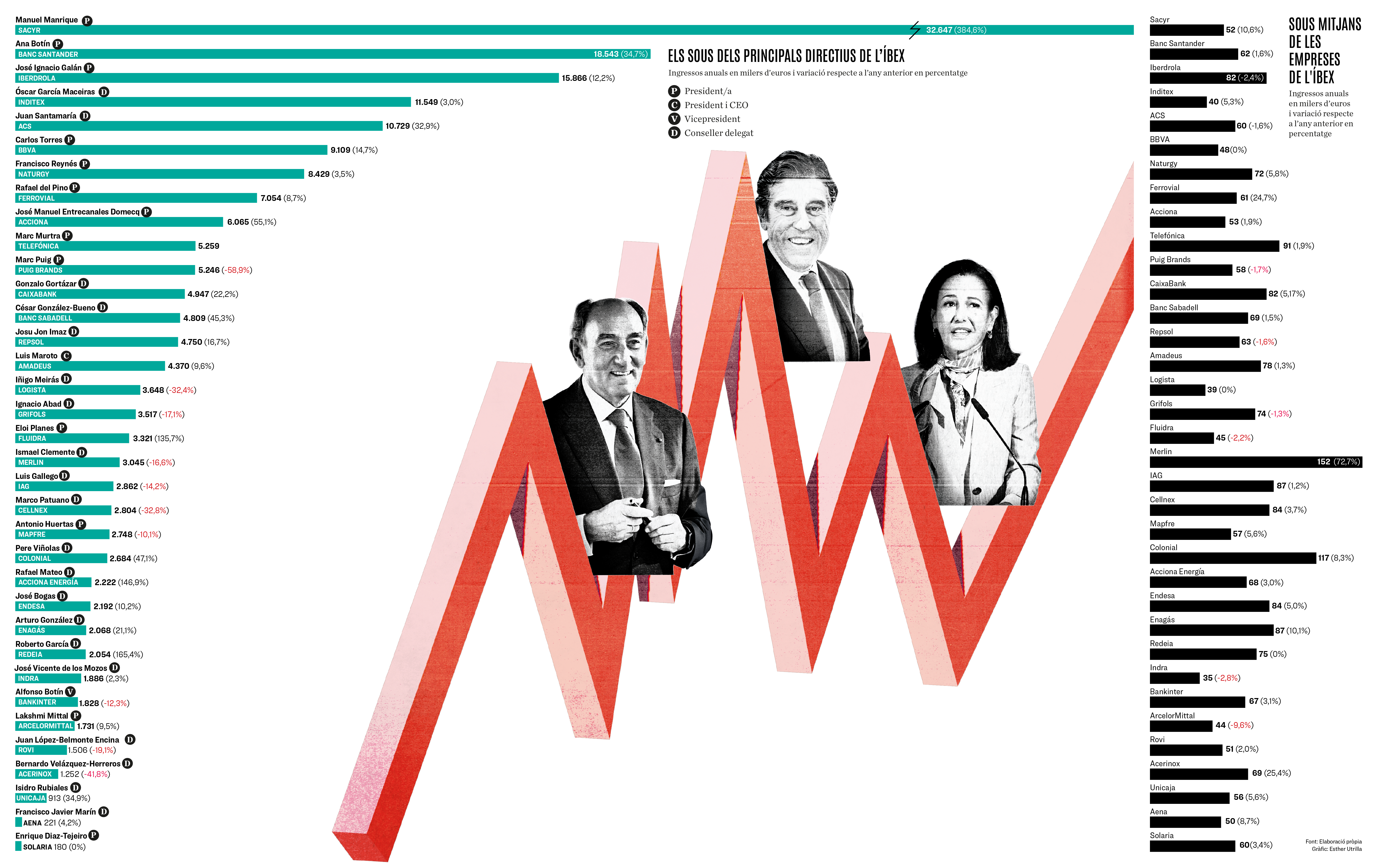 El segundo puesto en este podio del Ibex lo ocupó la presidenta del Banco Santander, Ana Botín, con 18,5 millones, con una subida del 34,63% respecto a 2024. No fue solo la directiva de la banca española mejor pagada sino que habría ocupado el primer puesto del conjunto del Ibex si no llega a ser por el plan de acciones de Sacyr, que catapultó los ingresos de Manuel Manrique. Los ingresos de Botín, de la familia que tradicionalmente ha tenido el control de la entidad financiera, multiplicaron por 299 el salario medio de la plantilla. En este banco, el consejero delegado, Héctor Grisi, ingresó 10,3 millones, un 23,84% más; y José Antonio Álvarez, que ocupó antes este cargo y ahora es vicepresidente, 6,6 millones, un 11,02% más. La medalla de bronce en este podio de altos ejecutivos fue para otro habitual en los primeros puestos, el presidente de Iberdrola, José Ignacio Sánchez Galán, con 15,86 millones de euros, un 12,17% más, 193 veces más que el salario medio de su plantilla.