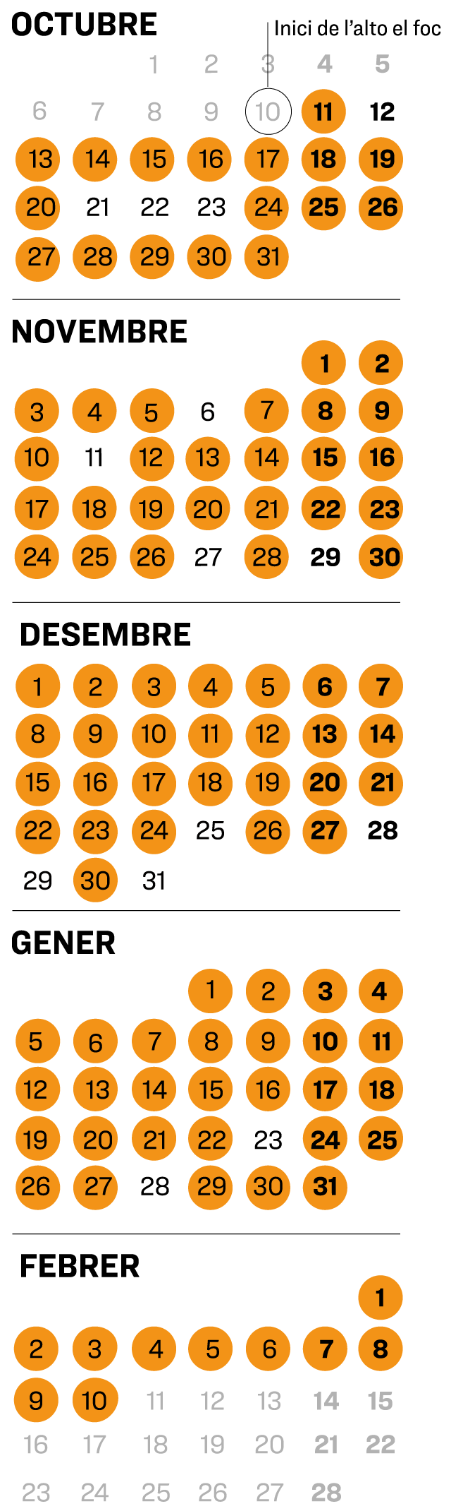 Israel tampoco ha cumplido con el plan que debía llevar la paz a Gaza en lo que se refiere a los ataques sobre la Franja. El ejército hebreo incumplió el alto el fuego 107 días de los últimos 124. Casi la mitad de los incidentes registrados fueron bombardeos y ataques dirigidos, según el ministerio de Sanidad de Gaza. Es decir, no habrían sido fruto de un conflicto más o menos espontáneo en el que los militares israelíes han decidido que era necesario abrir fuego para enderezar la situación, sino que habría habido una mínima planificación por parte de Tel Aviv. Esta situación hasta ahora se ha saldado con la muerte de 586 palestinos, además de 1.558 gazatinos heridos.
