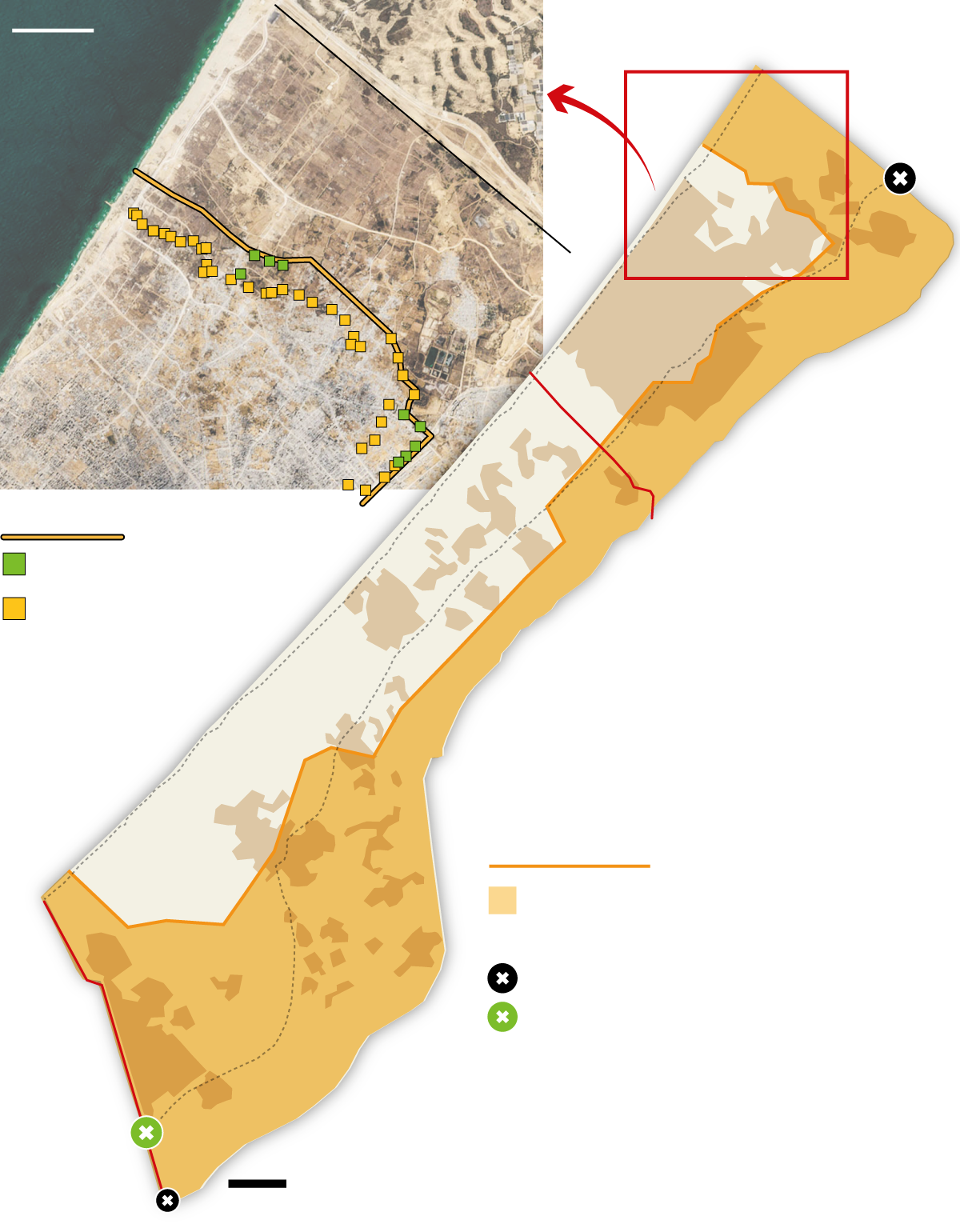 El plan impulsado por el presidente de EEUU fija una zona de la Franja (en amarillo en el mapa) en la que Israel tiene el control militar. Una vez completado el intercambio de rehenes y con el supuesto alto el fuego en marcha, las fuerzas israelíes debían retroceder hasta la frontera internacional establecida en 1967.