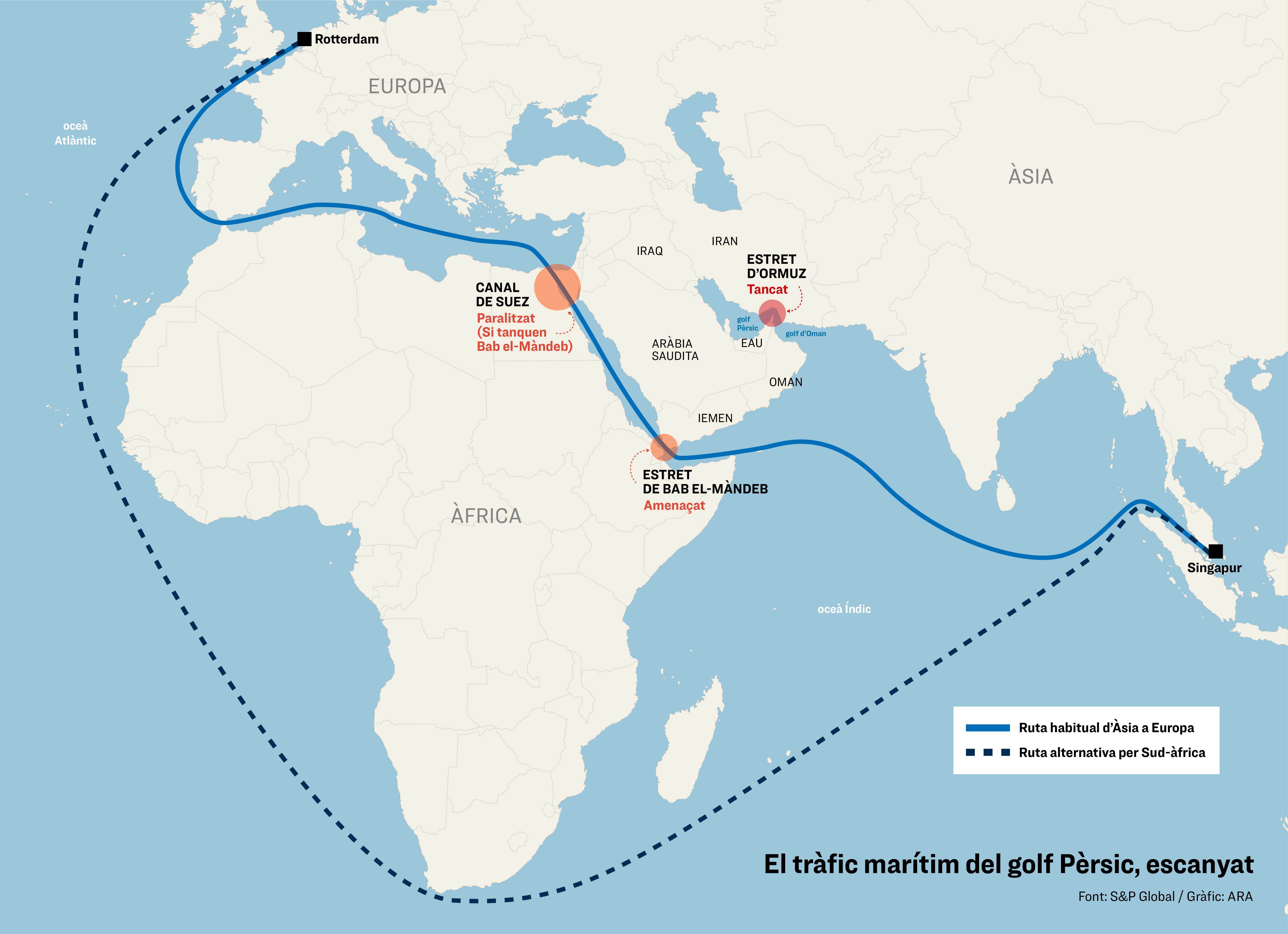 Este movimiento chií, que comparte con Irán el lema “Muerte a América y muerte a Israel”, controla grandes zonas de Yemen desde 2014, incluida su capital, Saná, y la mayoría de la población del país. Yemen está inmerso en una guerra civil desde 2014, después de las fallidas revoluciones del cambio de década. El movimiento entró en guerra contra Israel en octubre de 2023, en solidaridad con los palestinos de la Franja de Gaza, y atacó los barcos en Bab el-Màndeb como medida de presión. El resultado fue que las grandes compañías navieras, en lugar de seguir la ruta habitual por el mar Rojo hacia el canal de Suez, que conecta con el Mediterráneo, tuvieron que dar una vuelta enorme, rodeando todo el continente africano para llegar a Europa, con el consiguiente aumento de costes.